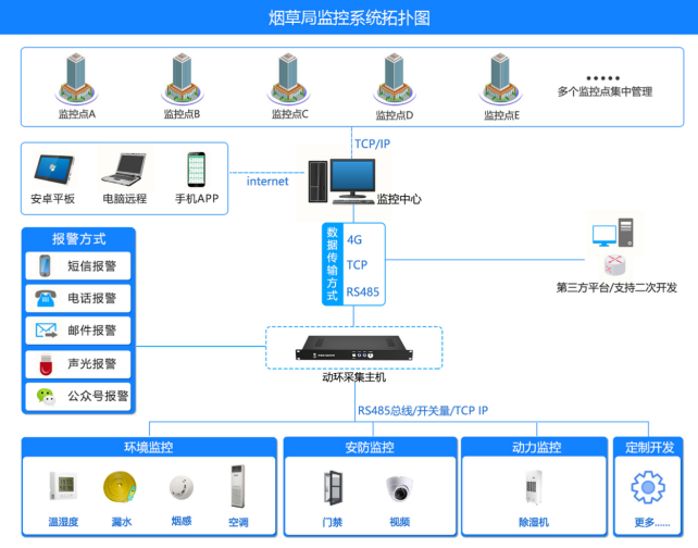 数据采集层:针对仓库动力监控、环境监控、安全监控、微环境监控等数据采集模块采集数据,通过各种总线传送到监控主机;