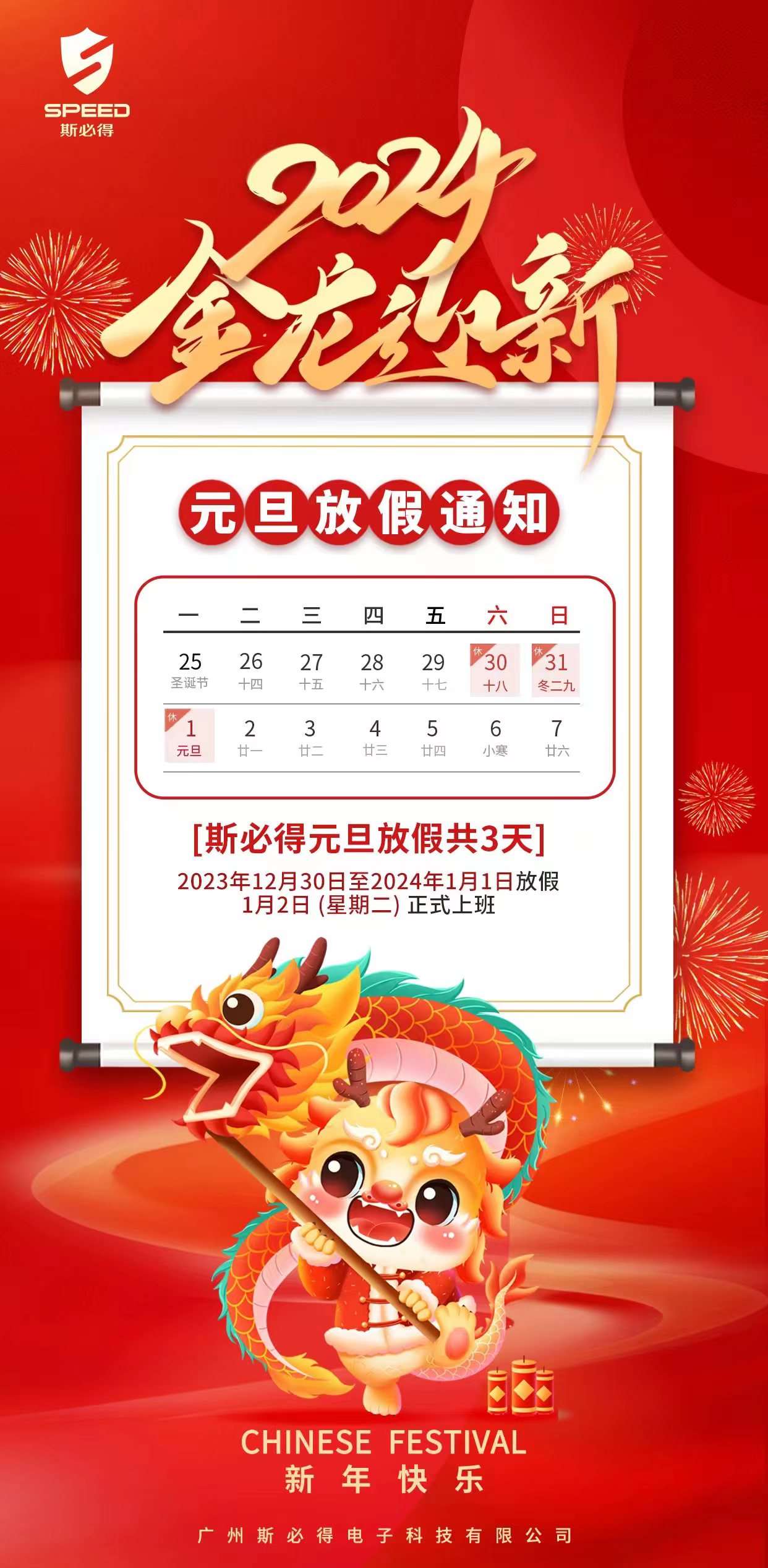 在2023年12月31日23时59分59秒,伴随这钟声响彻夜空的时候,我们迎来了一个充满期待的2024年,值此佳节之际,谨代广州斯必得电子科技有限公司,向所有的新老客户、合作商、全体员工表示衷心的感谢,祝愿大家在2024年里,工作顺利、心想事成、生活如画。