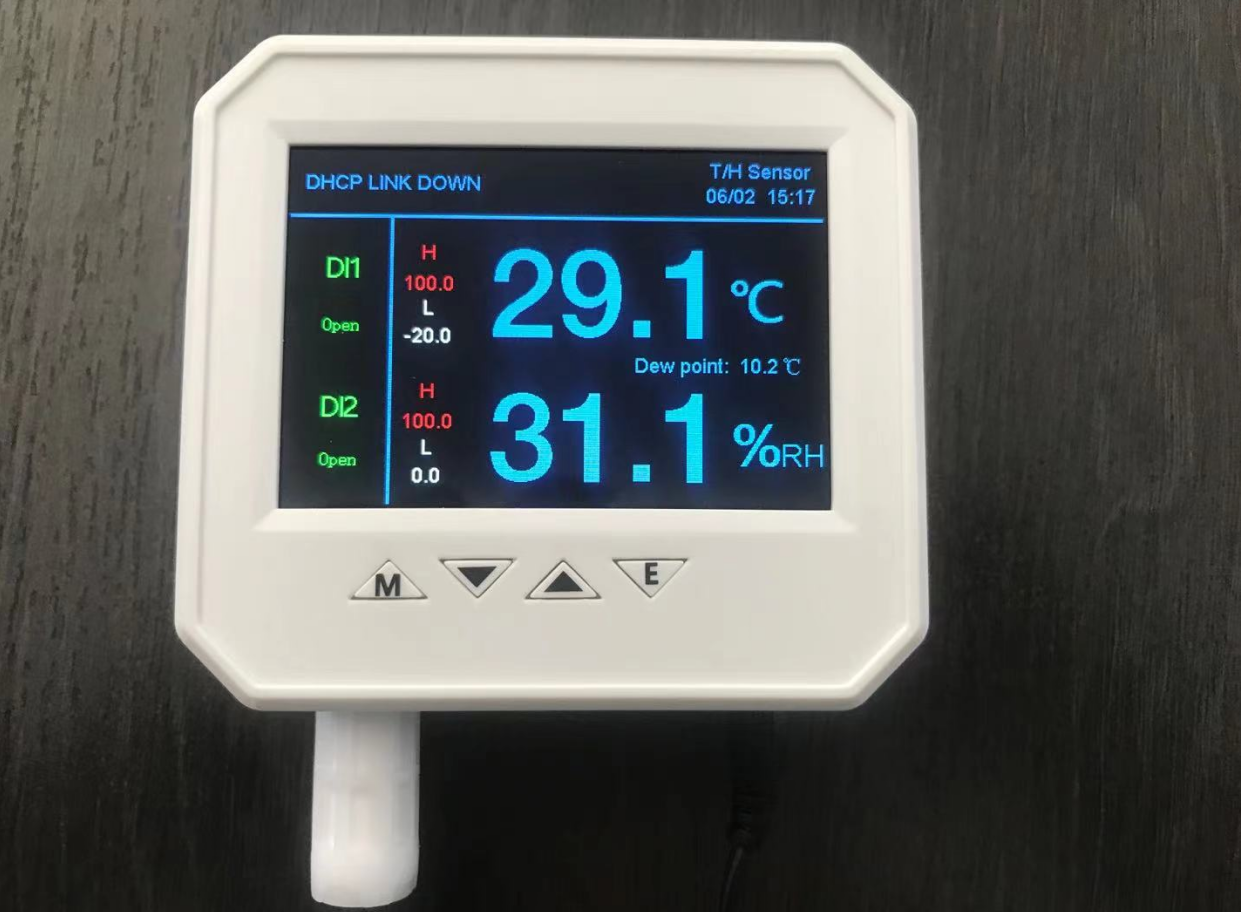 1、 设备功能 :SPD-HT485_TCP采用3.4寸彩色液晶显示屏 ,支持webserver,测量值可以在显示屏、web页面或网络读取到,设备支持以下网络通讯协议:Modbus TCP协议、 SNMPv1/v2协议、 UDP协议、MQTT协