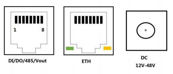 设备下方有3个接口: DI/ DO/485/Vout 接口、ETH 网络通讯接口、DC12V-48V。