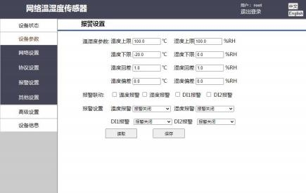 用户在该页面可以设置温度、湿度上下限报警阈值、报警回差值,用户可以自由选择是否开启报警以及报警触发条件,同时在该页面用户可以选择报警是否需要联动继电器,如果选择联动,那么报警触发时,继电器将会工作。